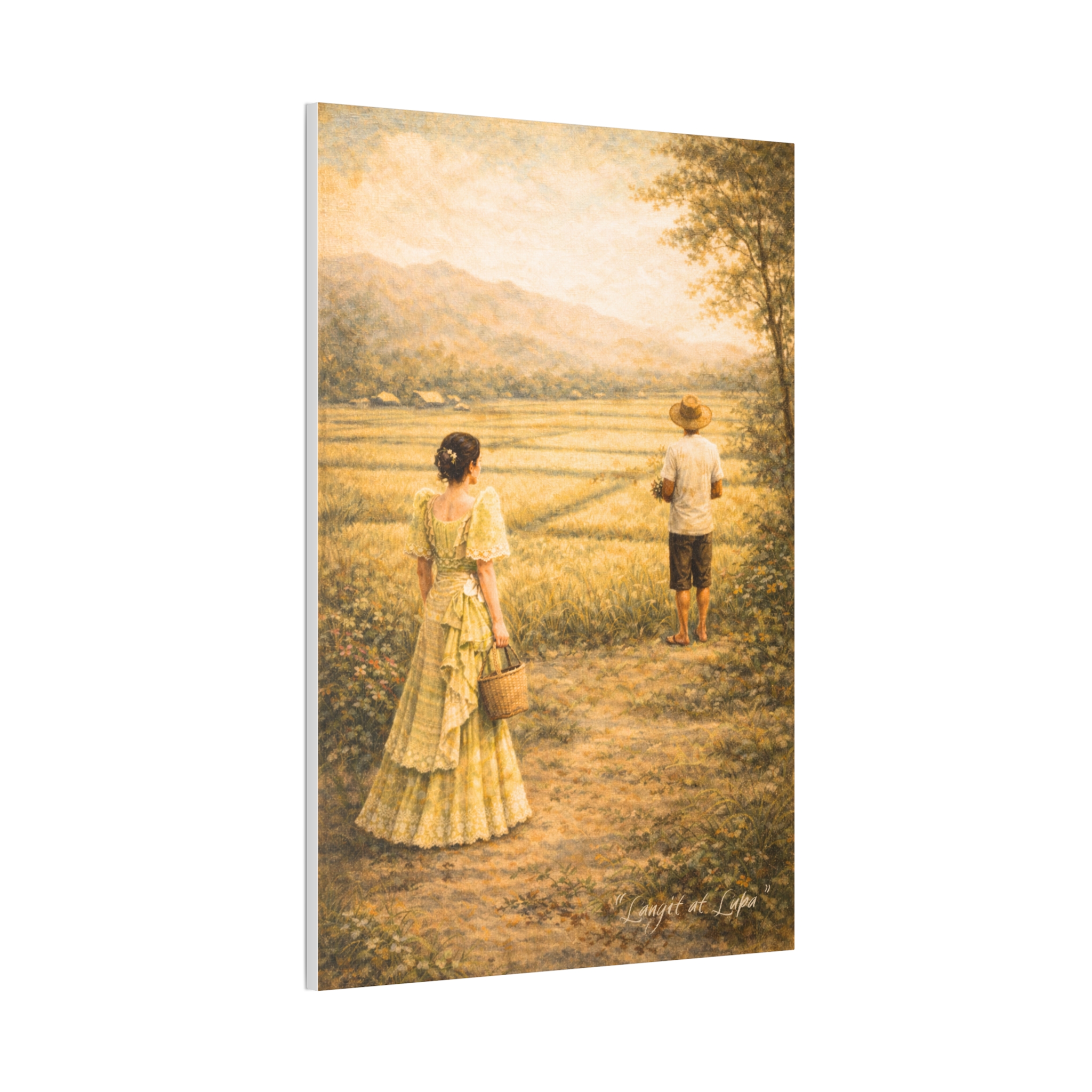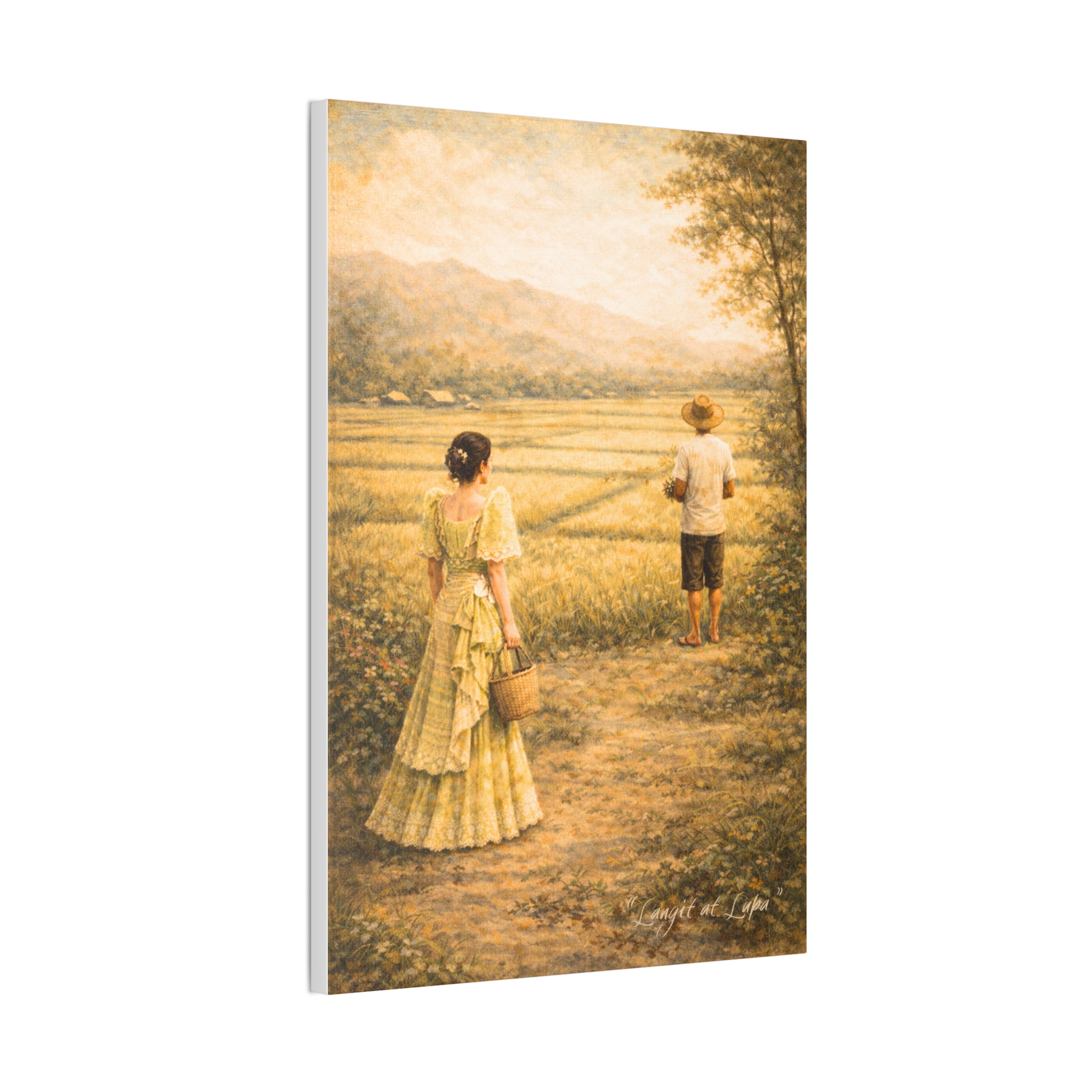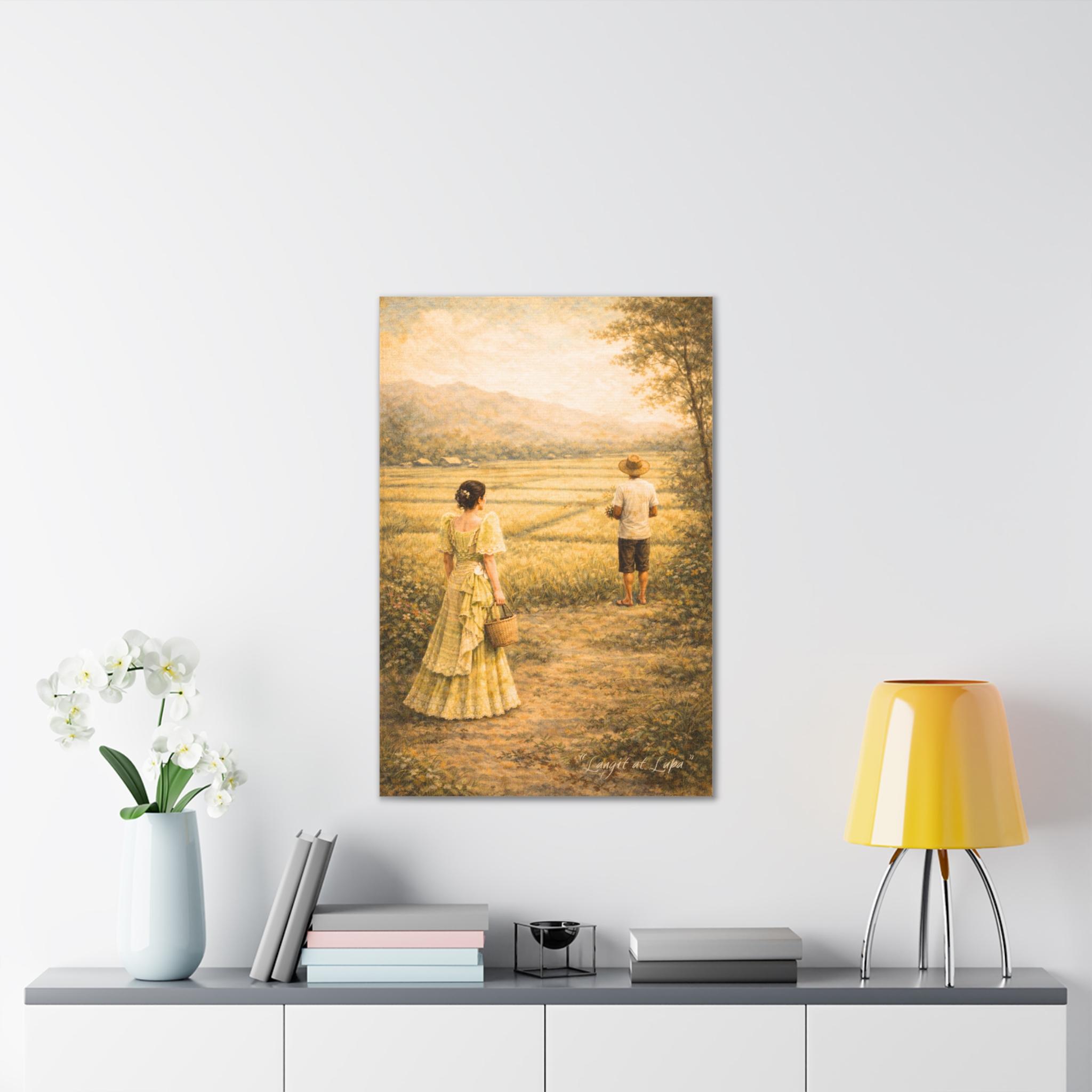 A warm, painterly canvas that brings a quiet countryside moment into your home. Soft golden light, distant hills and a pair of figures walking through a sunlit field create a gentle, nostalgic mood. Hung in a hallway or living room, the stretched canvas adds texture and a handcrafted feel — the pinewood stretcher and vivid print keep the scene feeling immediate and alive. Small details like the subtle brushwork, the mellow palette, and the slight edge-wrap of the image make it read like a memory rather than a photograph. Comes ready to hang with included hardware; available in multiple orientations and sizes to suit cozy nooks or larger walls.