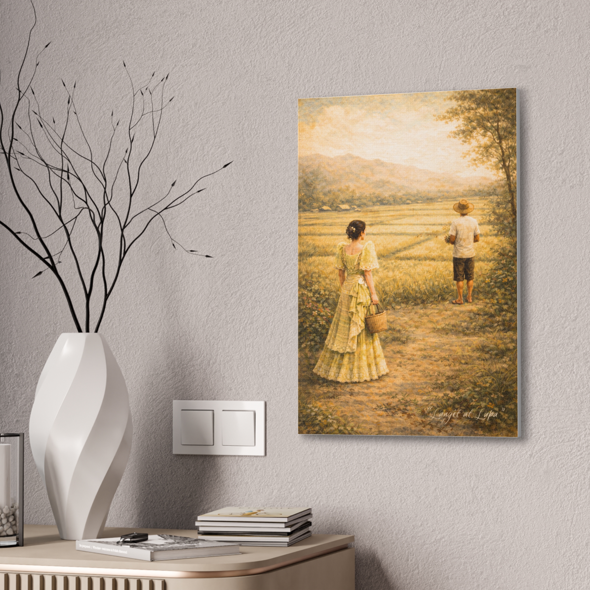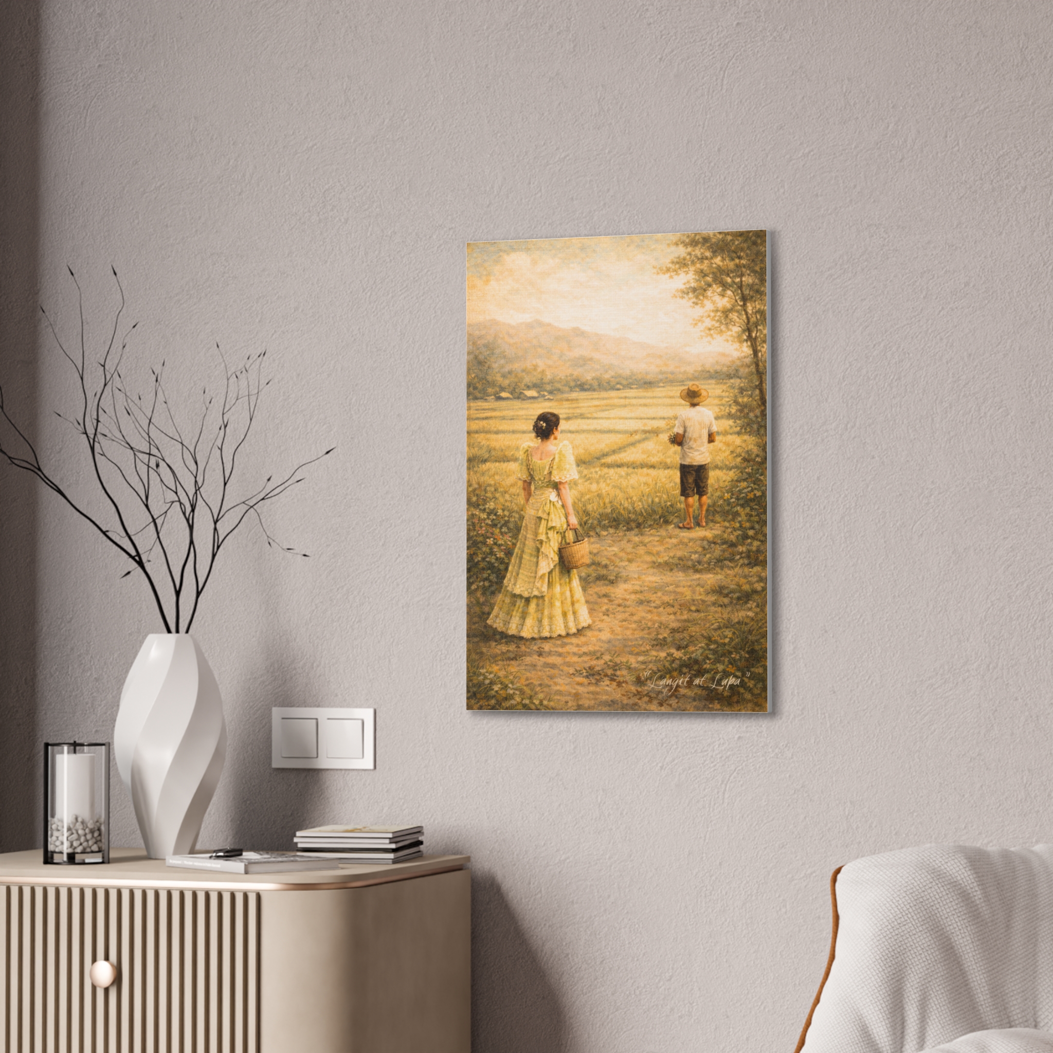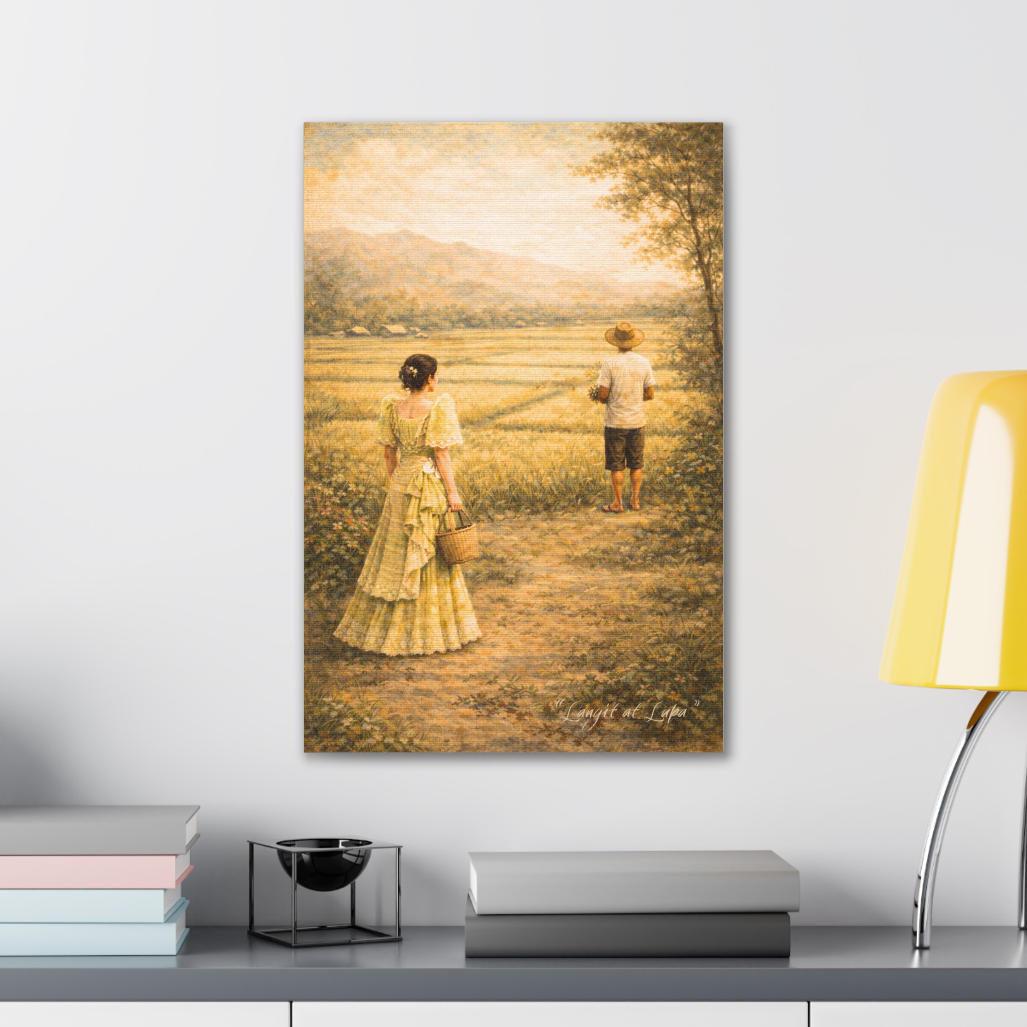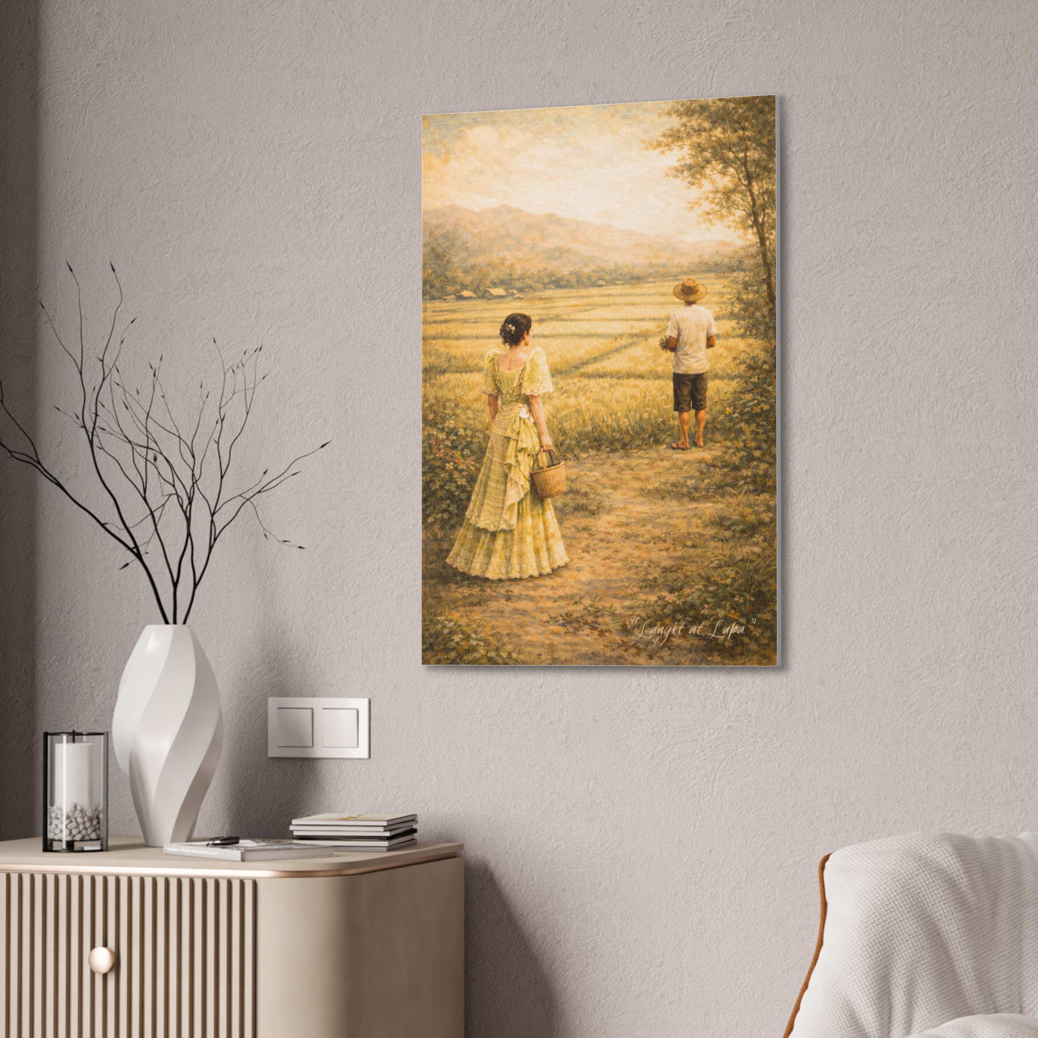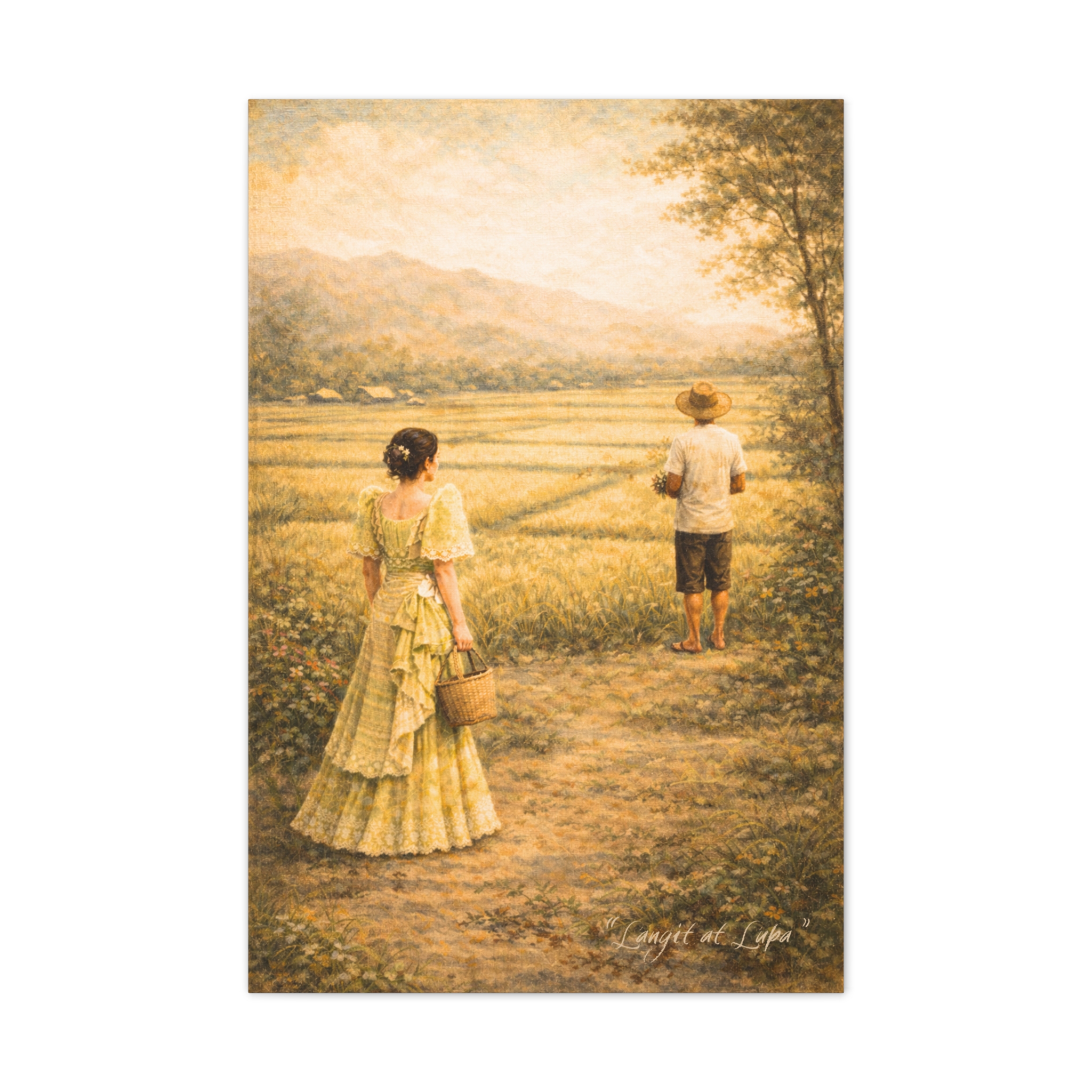 Langit at Lupa portrays a quiet countryside path between two figures: a woman in an elegant Filipiniana dress and a barefoot farmer standing ahead in the fields. The distance between them speaks louder than words—of class, restraint, and longing. Meaning “Heaven and Earth,” the piece reflects a bittersweet Filipino love story where social status divides, yet love endures, echoing romantic struggles shared across cultures.